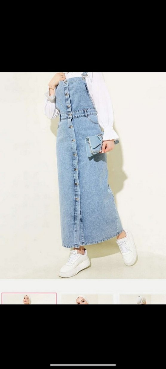 Açık mavi, düğmeli ön detaylı, bol kesim uzun denim tulum. Kolsuz ve yuvarlak yakalı, hafif batik desenli rahat sokak stili tulum.