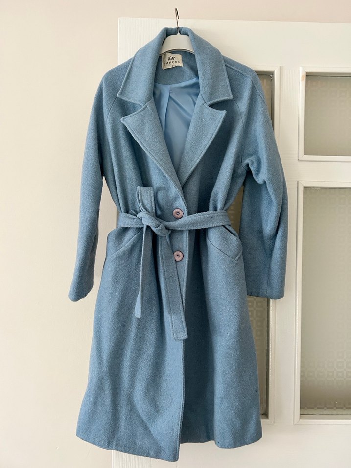 Mavi uzun kaban, yumuşak dokulu, geniş yakalı ve iki cep detaylıdır. İki düğme ile kapanır, iç kısmı astarlıdır. Bebe mavisi ayaz az giyildı