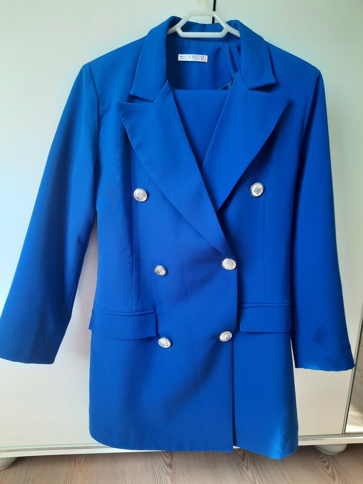 Parlak mavi renkte, düğmeli ve yakalı uzun kadın blazer ceket. Ofis için modern klasik tarzda, sentetik kumaştan, uzun kollu ve düz desensiz.