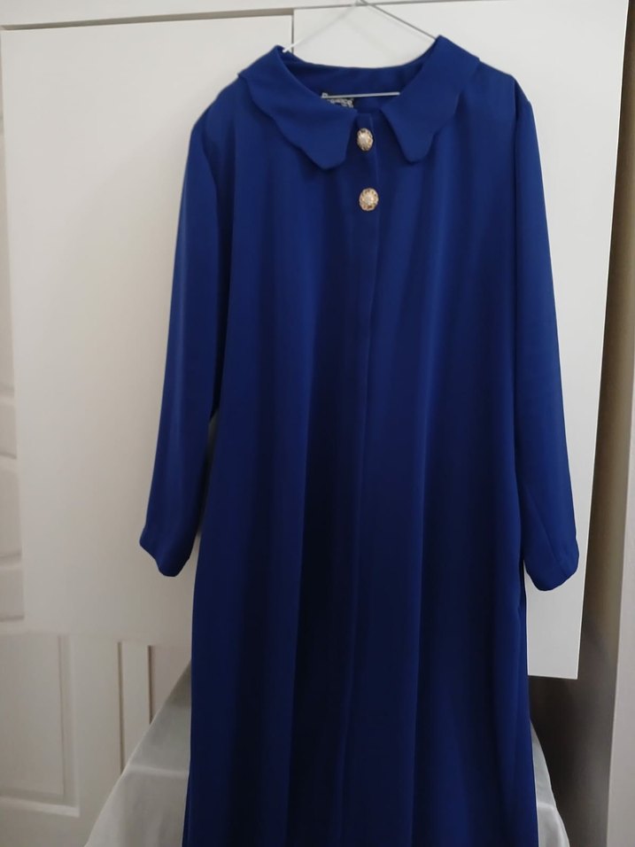 Mavi renkli, düğmeli uzun kadın pardesu. Yaka kısmı klasik kesim, bol ve uzun kolludur. Yumuşak ve sıcak dokulu kumaştandır.50 52 bedendir