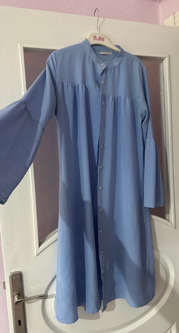 Pastel mavi keten kumaştan, düğmeli, uzun kollu, yakalı, bol kesim, sade ve mütevazı günlük kullanıma uygun tunik.