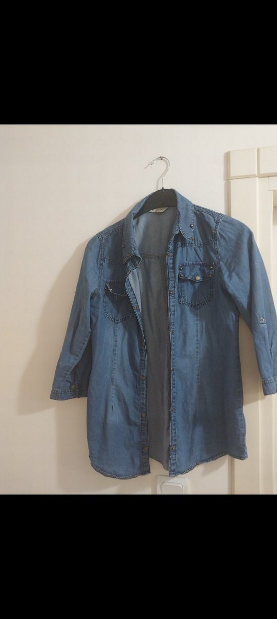 Mavi renkli, düğmeli önü ve yakalı tasarıma sahip uzun kollu denim gömlek. Salaş kesimi ve midi boyu günlük kullanıma uygundur.s beden sadece 2 yada 3 kes kullanildi