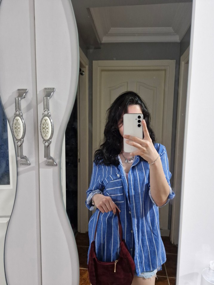 Mavi tonlarında, düğmeli ve uzun kollu, yakalı denim gömlek. Rahat kesimiyle gündelik kullanıma uygundur.