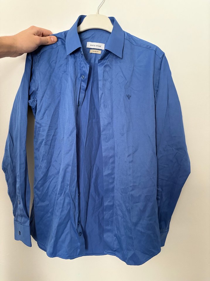 Whitestone Parlak mavi, ipeksi kumaştan yapılmış erkek gömleği. Düğmeli, uzun kollu ve geniş kesimdir, iş ortamı için uygundur. Slimfit s beden çok az kullanılmış