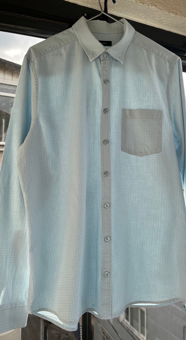 Pastel mavi renkte, düğmeli ve uzun kollu erkek gömleği. Normal kesim ve tek göğüs cebine sahiptir.