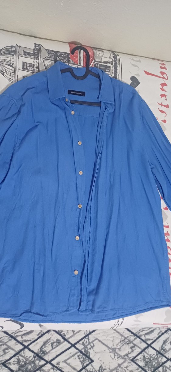 Parlak mavi renkte, uzun kollu, bol kesim keten erkek gömlek. Düğmeli ve yakalı, rahat sokak stili için uygundur.Kalıbı oversize diye geçiyor.