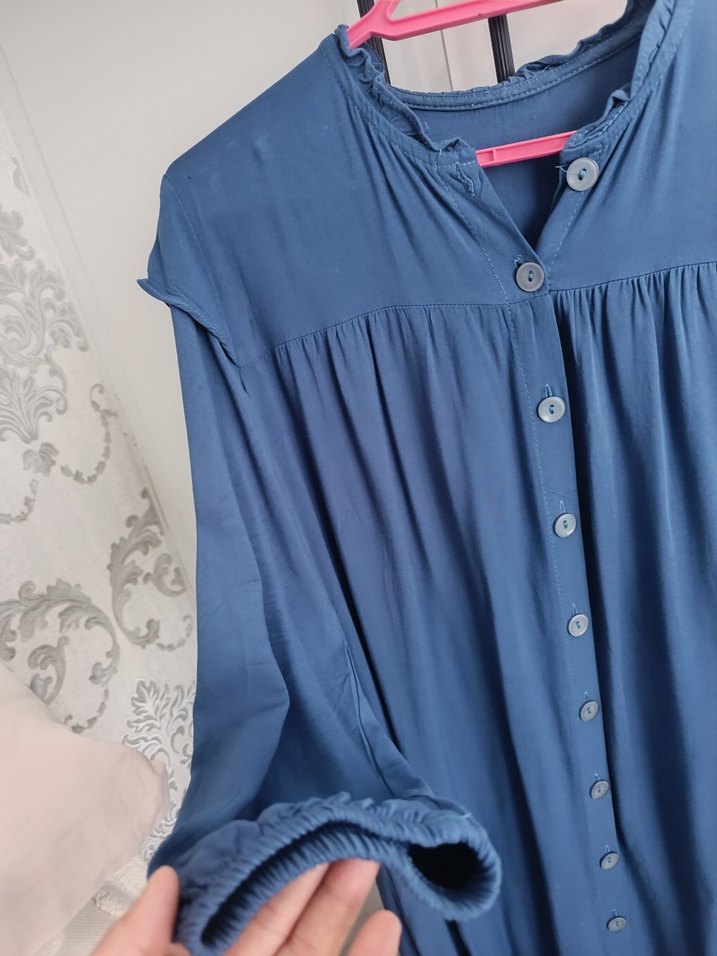 Mavi renkte, pamuk kumaştan üretilmiş, düğmeli, V yakalı ve uzun kollu bol kesim Rahat ve günlük kullanım için uygundur. kol kısmında ufak bir kusur var fazla belli olmuyor aslında görsellerde gösterdim
