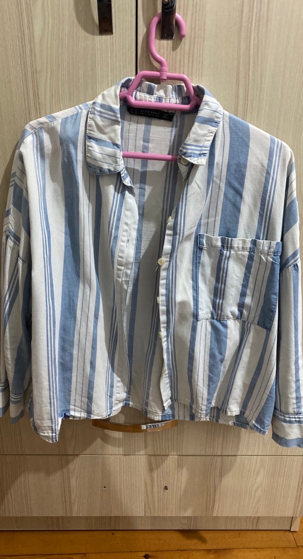 Mavi pastel çizgili, düğmeli, uzun kollu, pamuklu, yakalı ve bol kesim gömlek. Günlük kullanıma uygun rahat sokak stili.