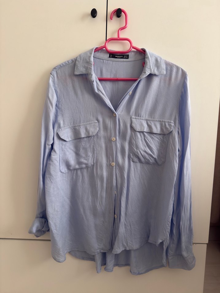 Mavi renkli kumaştan, düğmeli, uzun kollu, yakalı ve cepli bol kesim gömlek. Normal midi boyda, günlük rahat sokak stili için uygundur.