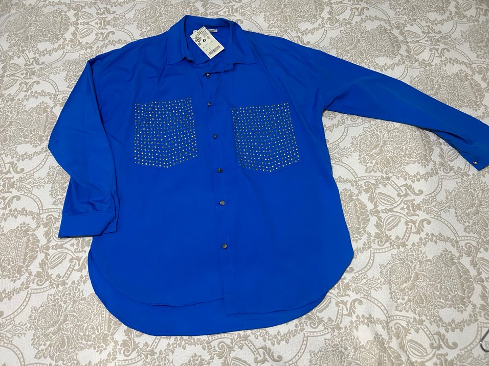 Mavi düğmeli kadın gömleği, uzun kollu ve yakalıdır. Rahat kesimi ve parlak işlemeli cepleriyle günlük kullanıma uygundur. ✨