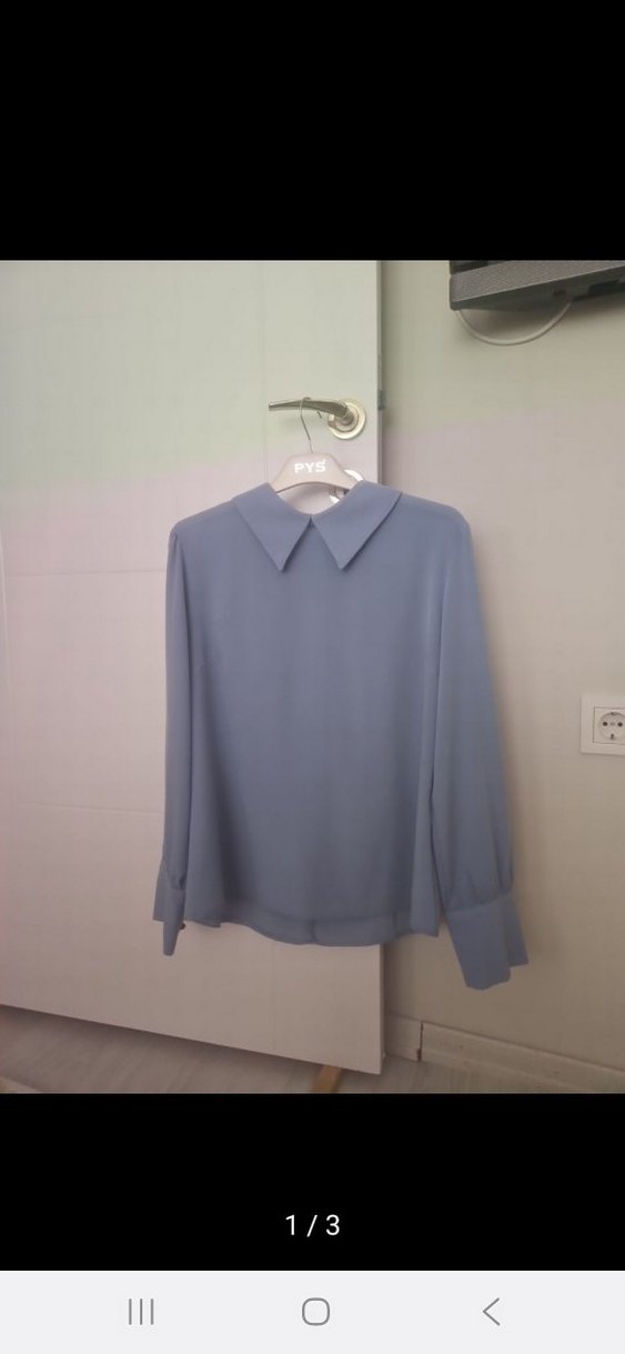 Düğmeli, uzun kollu, mavi kadın gömlek, rahat kesim ve yakalı, pürüzsüz sentetik kumaştan, ofis ve günlük kullanıma uygun.