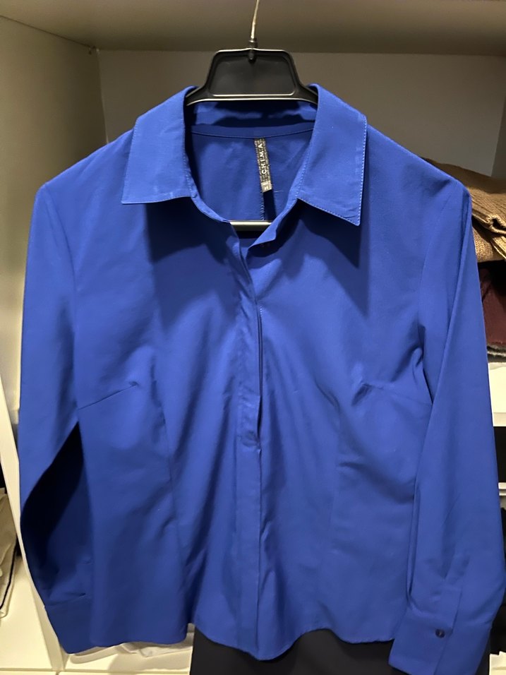 Kadın gömlek, yakalı ve uzun kollu, düğmeli ön kapama ile. Regular kesim ve parlak mavi renkte, ofis için uygundur.