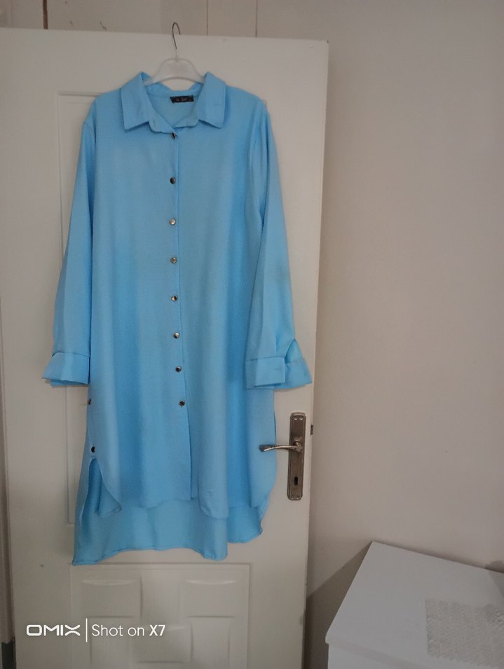 bebe mavisi renkte, uzun kollu ve düğmeli, yakalı, bol kesim kadın pantolon tunik. keten Yumuşak sentetik kumaştan üretilmiş, gündelik kullanım için uygundur. 50 beden 1 kere denemelik giydim 2 saat