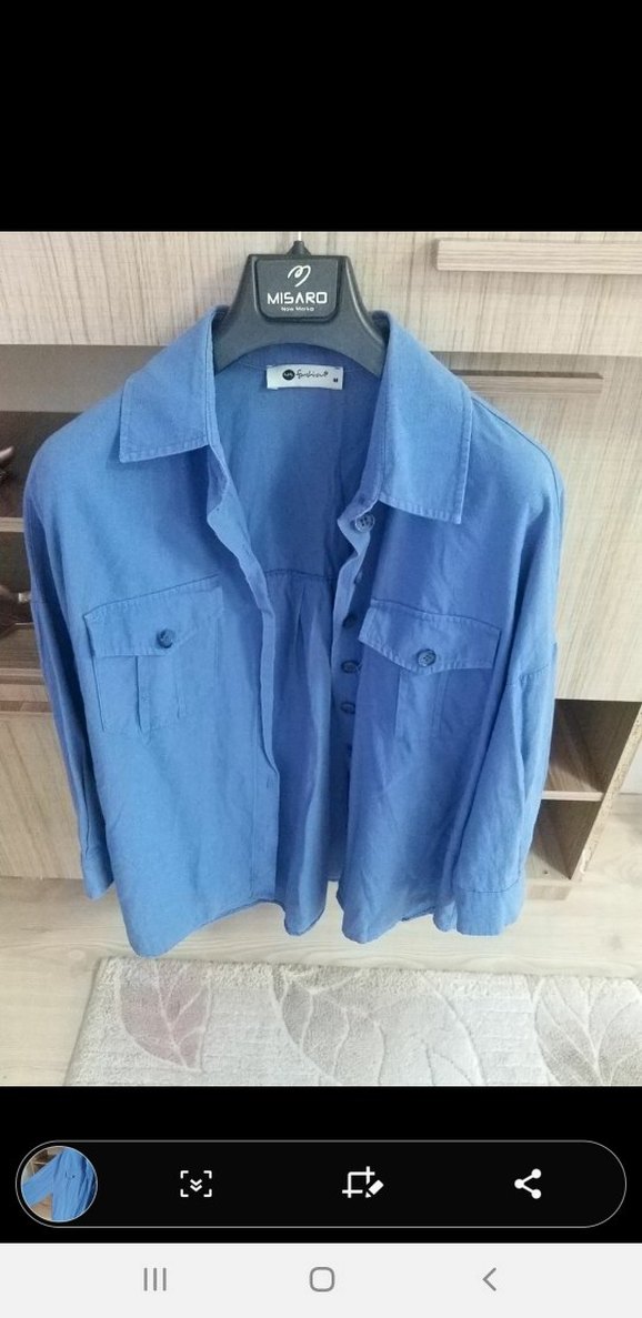 Mavi keten kumaştan, düğmeli ve cep detaylı, uzun kollu bol kesim gömlek. Rahat ve gündelik kullanıma uygun.