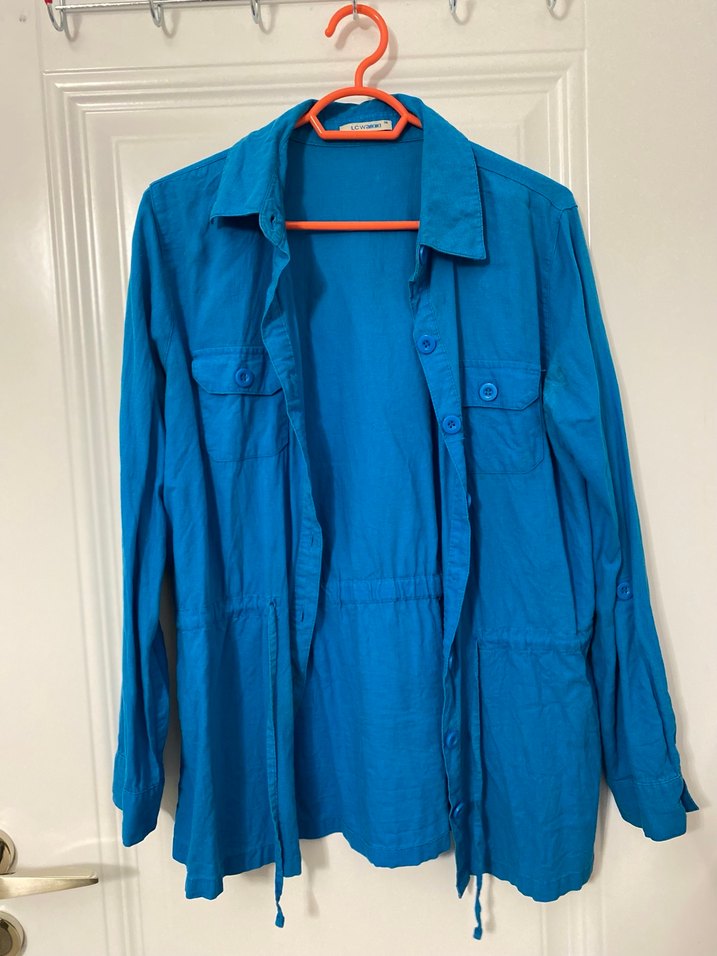 Parlak mavi keten kumaştan, uzun kollu, düğmeli ve bol kesim midi uzunlukta kadın gömleği. Notlu yaka ve günlük rahat stil için uygundur.