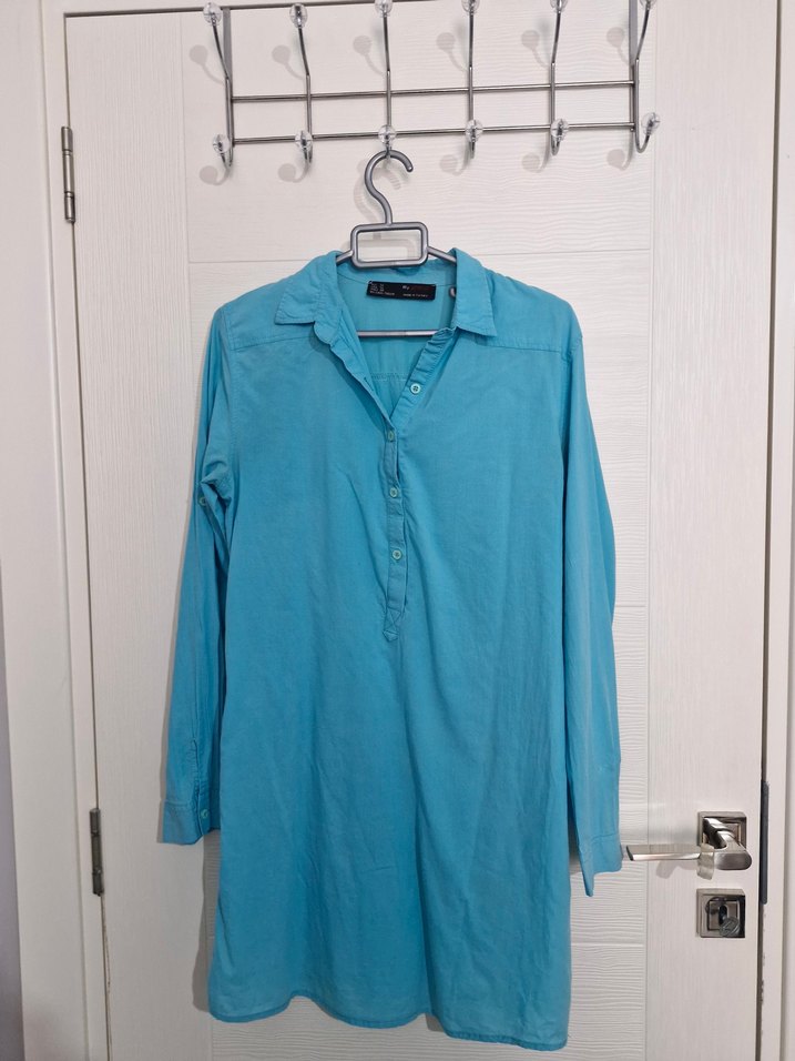 Mavi pamuk gömlek, uzun kollu ve düğmeli ön kısmıyla rahat bir kesime sahip. Normal midi boyda, günlük kullanıma uygun. Tesettüre uygundur.