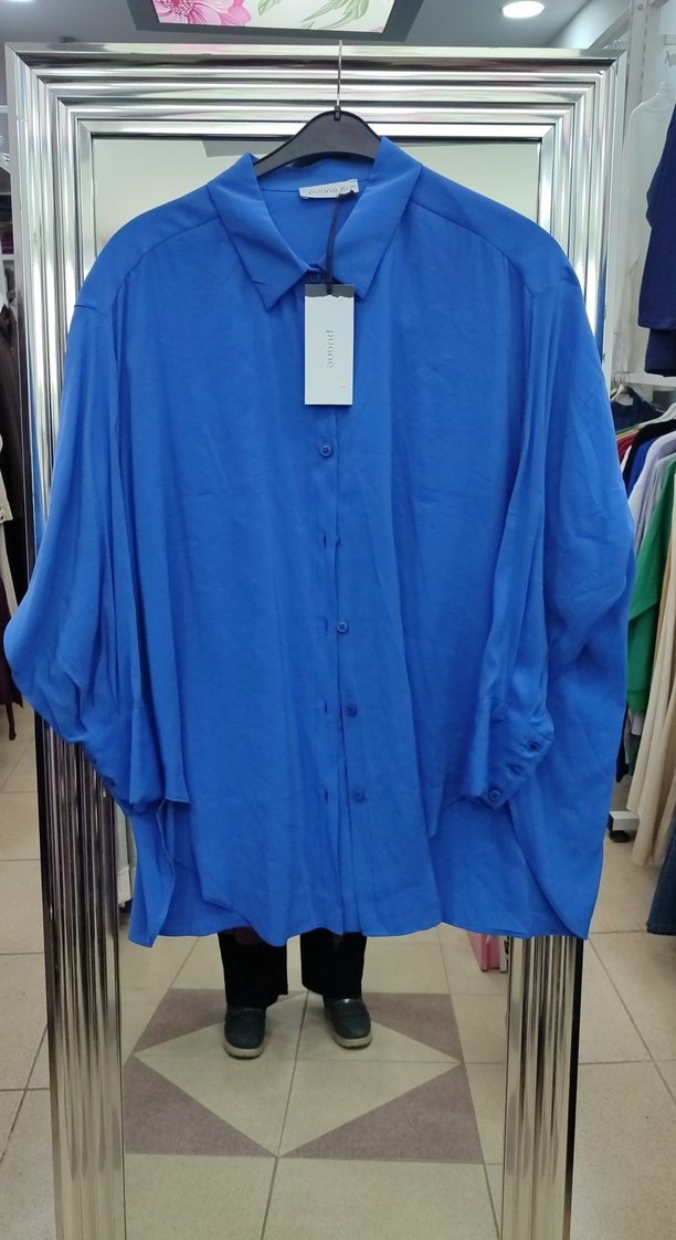Mavi renk, düğmeli, uzun kollu, yakalı ve salaş kesim kadın gömlek. İpeksi kumaştan üretilmiş, parlak görünümlü, ofis kullanımı için uygun.ürün mağaza ürünüdür