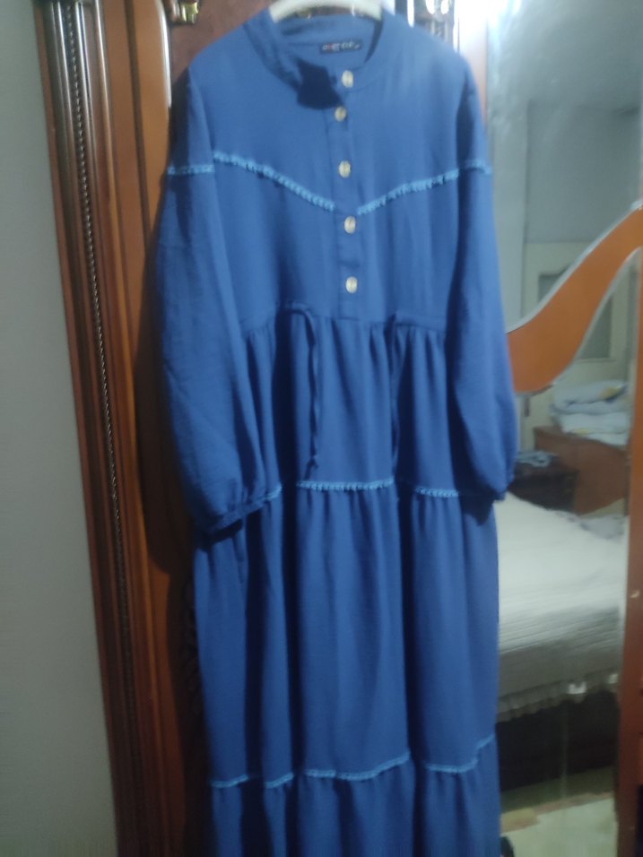 Düğmeli, uzun kollu, yuvarlak yakalı, salaş kesim mavi elbise. Renkli tie-dye desenli, bohem tarzda, yumuşak sentetik kumaştan yapılmıştır.