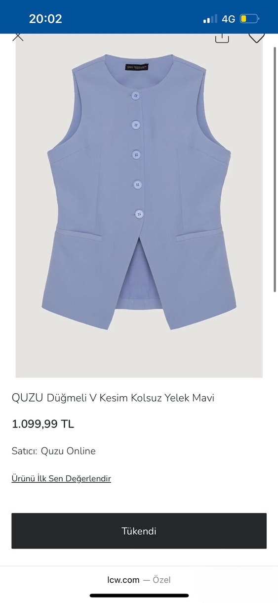 Pastel mavisi, düğmeli ve V kesim yakalı kolsuz blazer yelek. İpek gibi dokuda, normal kesim ve midi boyda, ofis için uygun sade tasarım. Çok güzel kombinlenebilir