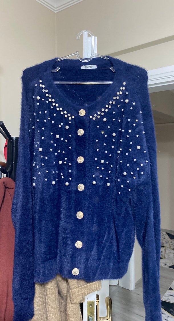 Parlak mavi renkli, düğmeli ve V yakalı örme kadın hırka. İnci detaylarıyla süslenmiş, bol kesim ve uzun kolludur. Günlük kullanıma uygundur. ✨ Çok az kullanıldı Standart beden