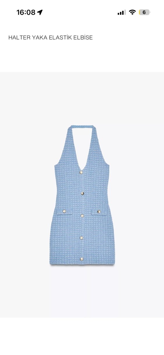 Mavi kot kumaştan, düğmeli ve V yakalı, regular fit midi elbise. Pastel ekose deseniyle sokak modasına uygun.