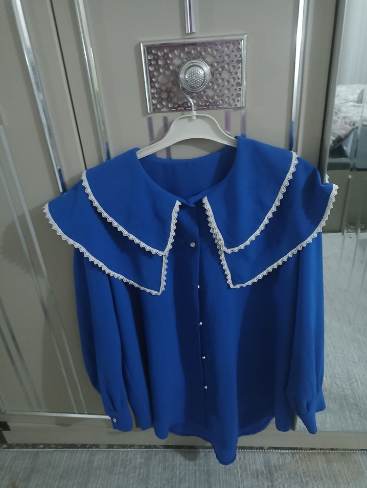 Bu bol kesim kadın gömlek, parlak mavi örme kumaştan yapılmıştır. Düğmeli, yakalı ve uzun kolludur. Sokak stiline uygun, eski Paris esintili katmanlı yaka detayı vardır. Günlük kullanım için uygundur.
