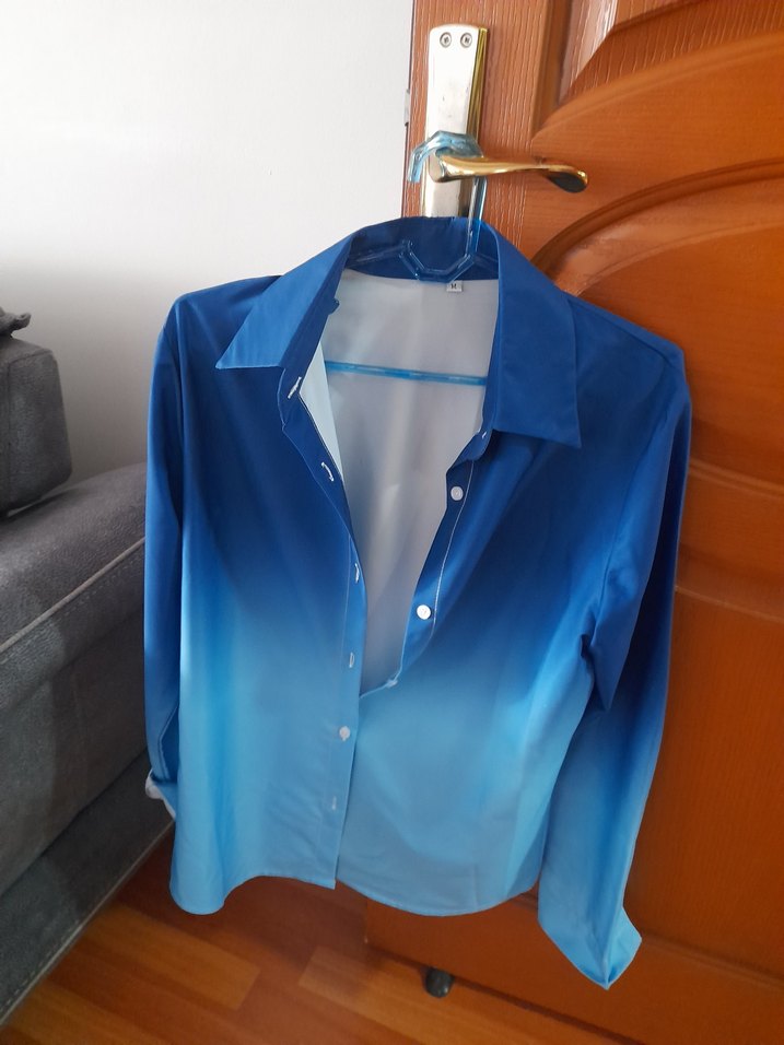 Mavi tonlarda, düğmeli ve yakalı kadın gömleği. Uzun kollu, bol kesim ve normal midi boyda, yumuşak ve parlak kumaştan üretilmiştir. Casual sokak stili için uygundur.