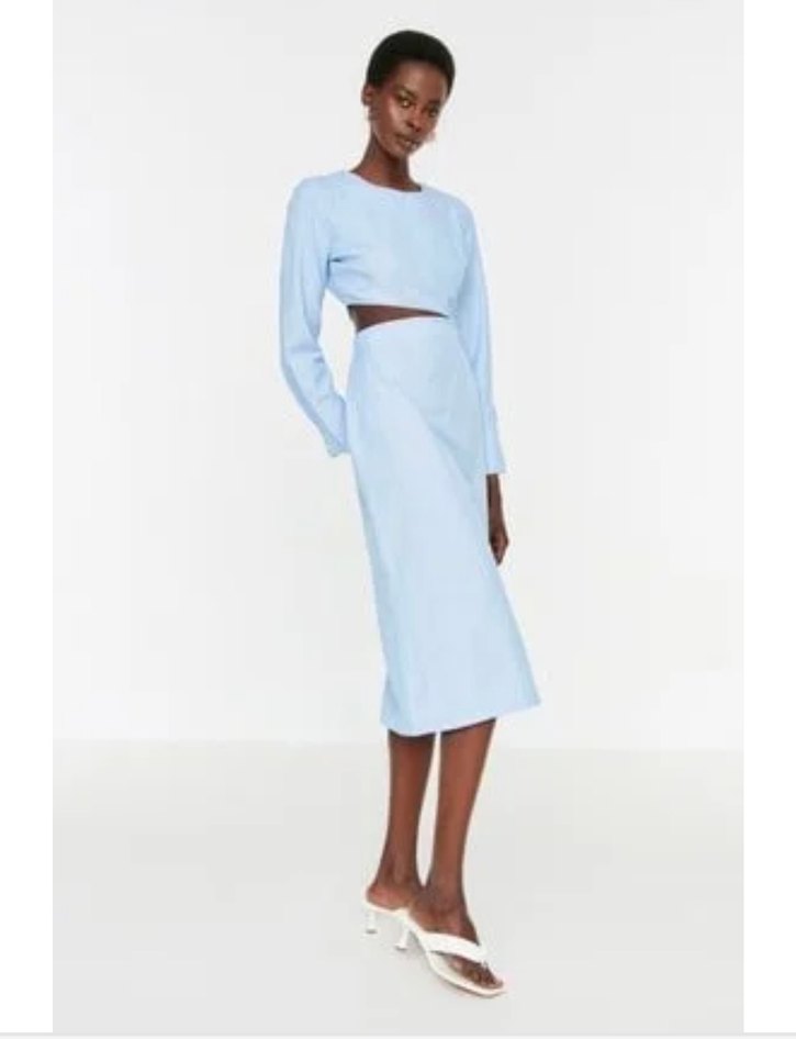 Yumuşak keten kumaştan, drapeli ve uzun kollu, gövdeyi saran mavi tonlarda elbise, ofis için uygundur.