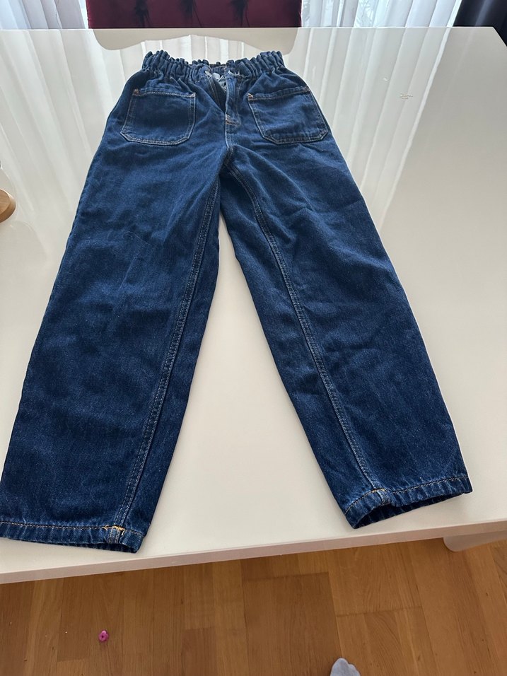 Parlak mavi renkte, bol kesim midi uzunluğunda, elastik bel ve ön cepli kız kot pantolon.