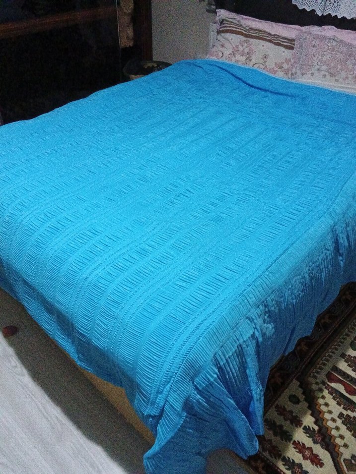 Canlı mavi renkte, desen içermeyen düzgün dokulu yatak örtüsü. Her yatak odasına parlak bir dokunuş katar. ️