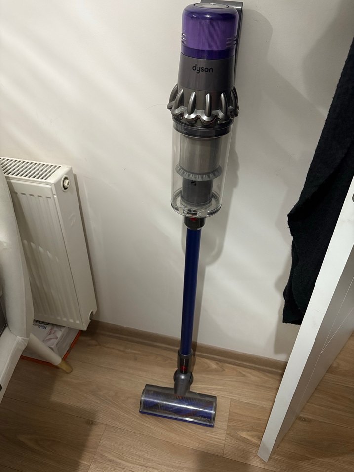 Koyu mavi Dyson kablosuz elektrikli süpürge, şeffaf toz haznesi ve mor üst kısmıyla kullanımı kolay ince tasarıma sahiptir. Hiçbir sorunu yoktur pil durumu çok iyi Izmir gaziemir optimum Media marktan alınmıştır