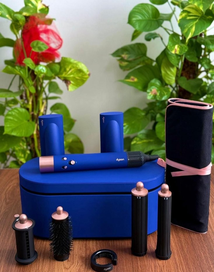 Mavi Dyson saç şekillendirici set, farklı başlıklar ve taşınabilir kutu ile çok yönlü saç şekillendirme sağlar.