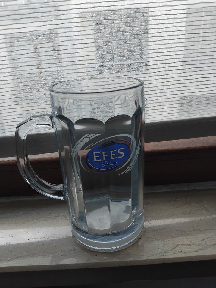 Parlak mavi renkte, kulplu ve kabartmalı Efes bira bardağıdır. yarım litre alır.