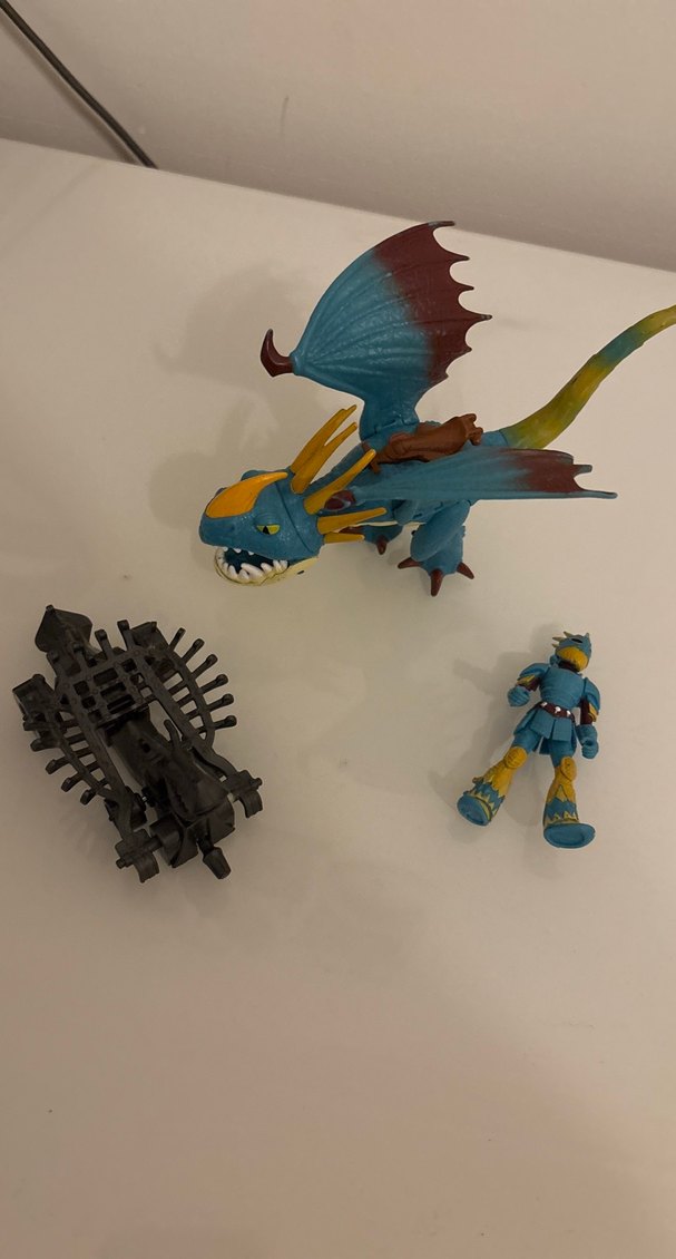 Kanatlı mavi ejderha ve zırhlı küçük figür ile siyah bir silah aksesuarından oluşan oyuncak seti. Detaylı tasarıma ve canlı renklere sahip.