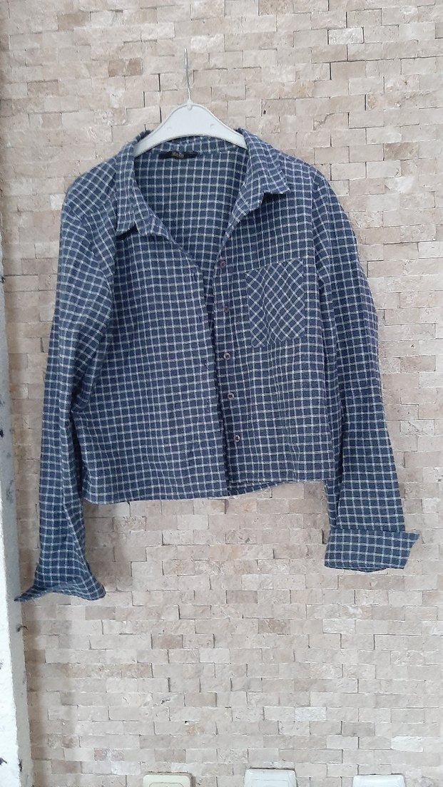 Uzun kollu, düğmeli mavi ekose desenli denim gömlek. Notlu yaka ve rahat kesimiyle gündelik sokak stili için uygun.