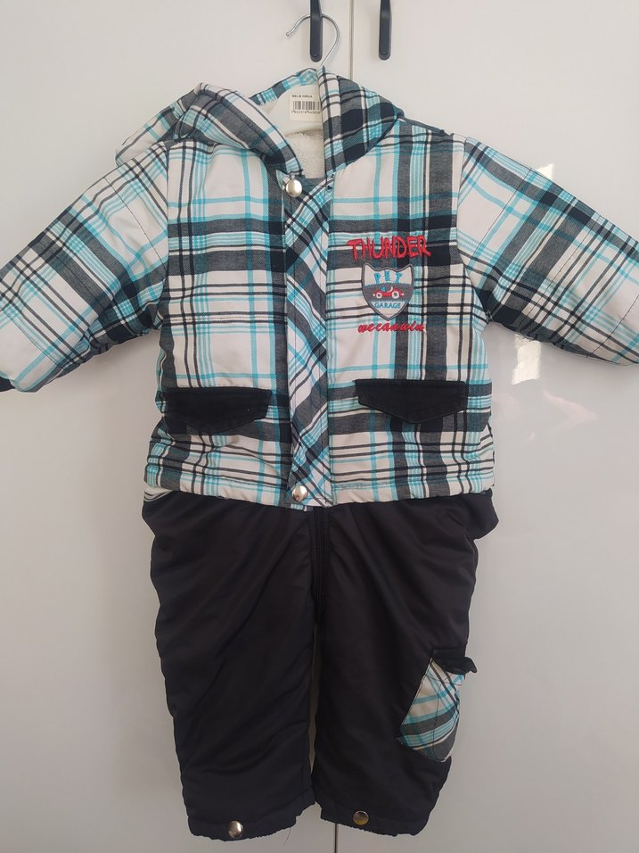 Düğmeli, mavi ekose desenli erkek bebek kar tulumu. Yumuşak ve sıcak tüylü kumaştan üretilmiş, alt kısmı siyah ve cep detayında ekose desen bulunuyor. ❄️