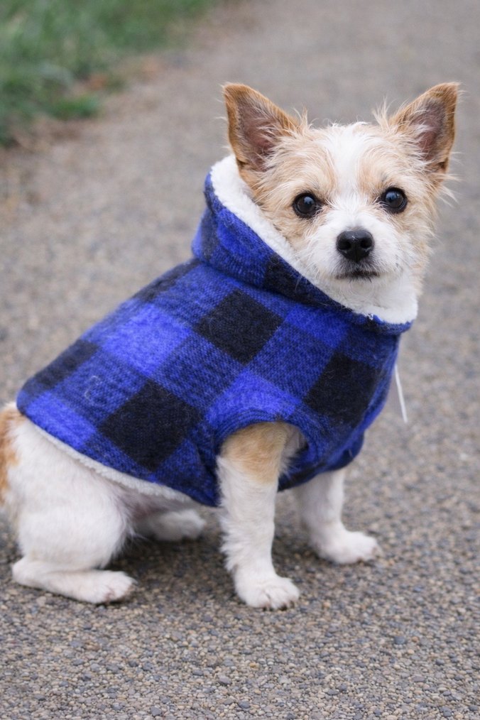 Mavi ekose desenli, yumuşak kürklü sokak stili köpek kıyafeti, sıcak ve rahat tutar. 3-5 kg kedi ve köpeklere uygun.