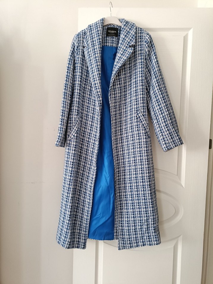 Mavi Ekose Desenli Uzun Kadın Kaban