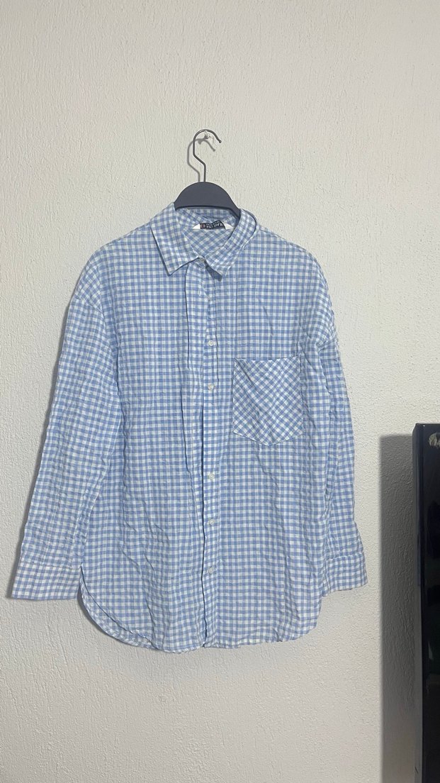 Salaş kesim, uzun kollu, yakalı ve düğmeli ön kısmı olan, yumuşak keten kumaştan yapılmış mavi pastel ekose desenli gömlek. Günlük rahat stil için uygundur.