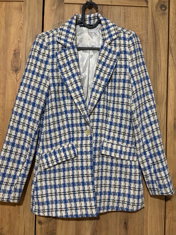 Mavi ekose desenli, düğmeli, normal kesim ve uzun kollu kadın blazer ceket. Midi boyda, ofis ve günlük kullanıma uygun şık bir modeldir. Boyu 68 cm.