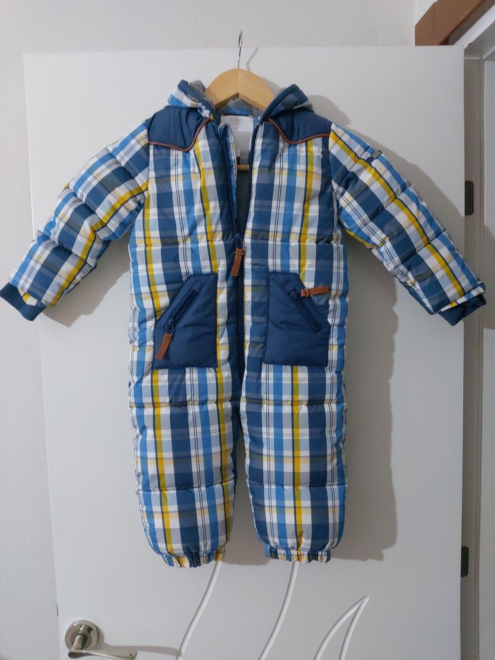 Renkli mavi ekose desenli, tokalı, yumuşak ve sıcak polar kumaştan erkek bebek kayak tulumu.