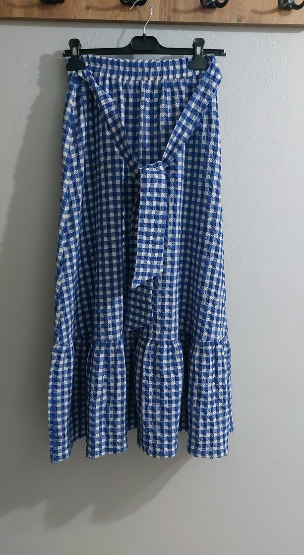 Mavi ekose desenli etek bol kesimle rahat bir bohem tarz sunar. yalnızca bir kere kullanıldı