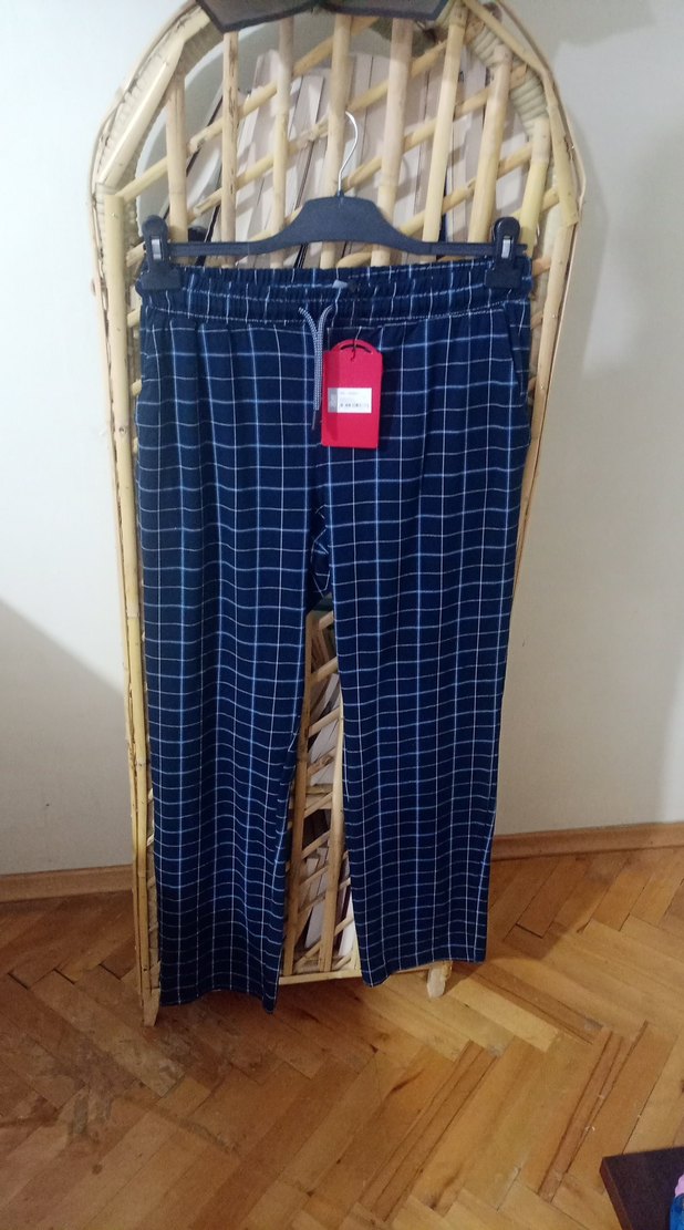 için koyu mavi ekose desenli kumaş pantolon. Normal boy midi kesim, kemerli ve rahat sentetik kumaştan yapılmıştır, günlük sokak stili için uygundur.