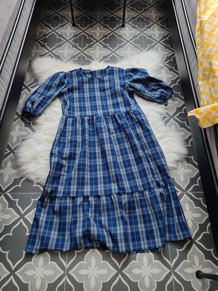 Mavi ekose desenli, salaş kesim uzun elbise. Tekne yakalı, pileli ve askılı kollu, yumuşak sentetik kumaştan üretilmiştir, günlük kullanıma uygundur. cepli 36 beden