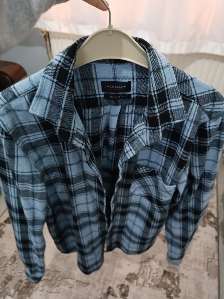 mavi renk, düğmeli ve kesik yakalı, yumuşak dokulu kumaştan yapılmış kışlık gömlek. Uzun kollu, günlük rahat stil için uygundur.