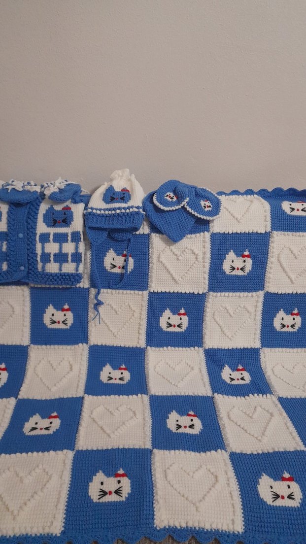 Mavi ekoseli örgü çocuk battaniyesi, sevimli kedi ve kalp desenleriyle renkli ve yumuşak bir seçenek sunar. Tunus işi el örgüsü battaniyeli takım