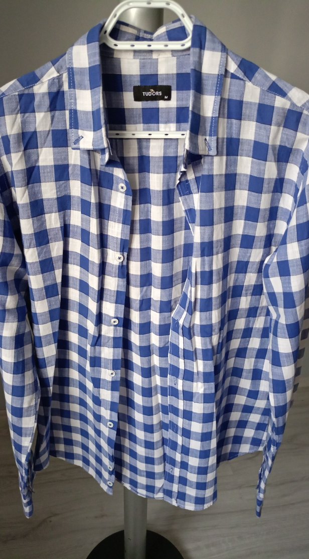Düğmeli, uzun kollu ve yakalı pamuklu erkek gömleği. Mavi-beyaz parlak ekoseli desen, rahat bol kesim, günlük kullanıma uygun. boy 75 omuz 41cm