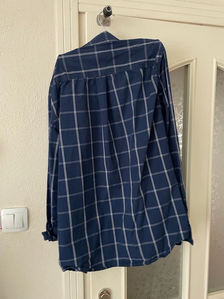 Mavi ekoseli keten kumaştan, uzun kollu, yakalı, düğmeli ve bol kesim kadın gömleği. Midi boyda, gündelik kullanım için uygun.