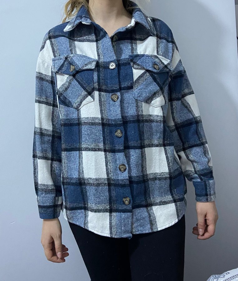 Mavi ve gri ekoseli denim gömlek, kesik yaka, düğmeli ön ve uzun kollu, bol ve midi boyda kesime sahiptir. Günlük sokak stili için uygundur.