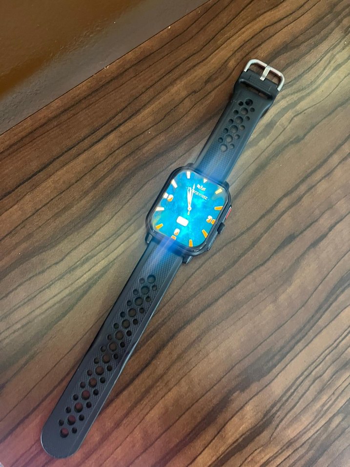 Bu akıllı saat koyu mavi delikli kayışa ve analog saat arayüzü gösteren canlı mavi ekrana sahiptir. ⌚